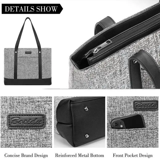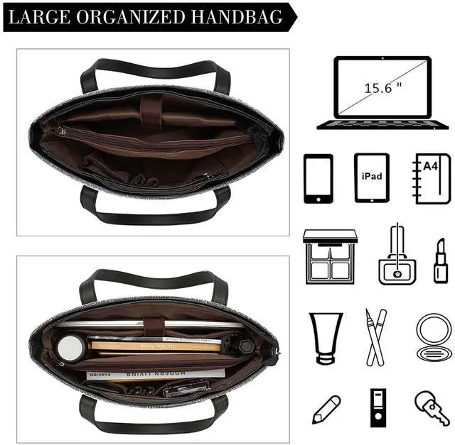 DescriptionProduct Description: Versatile work tote bags for women -- Capacious but not bulky, structured yet supple, the body-friendly design combines with a sleek shoulder strap for stylish and comfortable over-the-shoulder or on the arm wear. Our women laptop bag must be a casual-chic signature piece that is perfect for daily wear. One Bag with Plenty of Compartments and Pockets to Free Your Hands. - 1*Small outside zipper pocket for your belonging. - 1*Wall zipper pocket inside for cash, key and card. - 2*Slip pockets for cellphone, sunglasses, mouse. - 2*Open compartments for A4 files, books, folder, laptop charger. - 1*Zipper compartment makes sure your paper and files intact. - 1*Large compartment fits your 15.6" laptop.