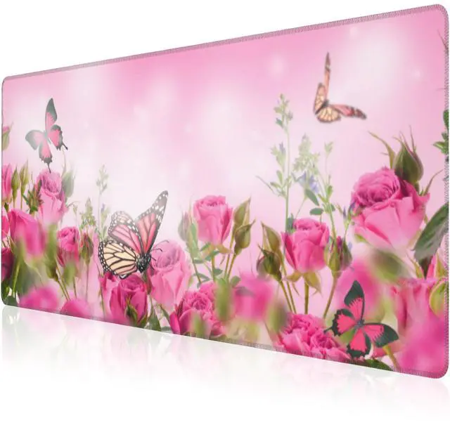 Mouse Pad, Large Pink Roses with Butterflies Desk Mat, Extended Non-Slip Gaming Keyboard Mousepad Desk Pad, Thick Stitched Edges Waterproof Mouse Mat 31.5"x15.7" (Beautiful Spring Floral)