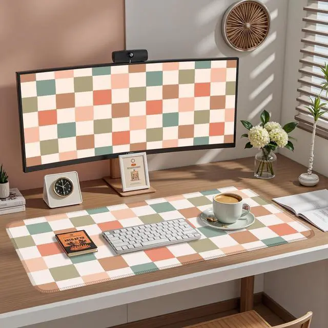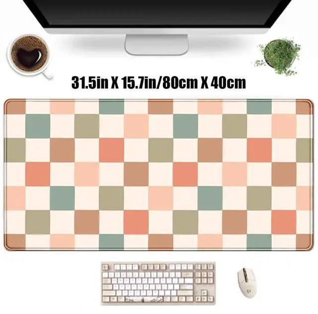 Boho Checkered Desk Mat, Retro Beige Plaid Mouse Pad Xl-31.5x15.7in-Pastel Desk Mousepad-Extended Aesthetic Keyboard Mouse Pad-for Kid Girl with Stitched Edges Non-Slip Office Decor