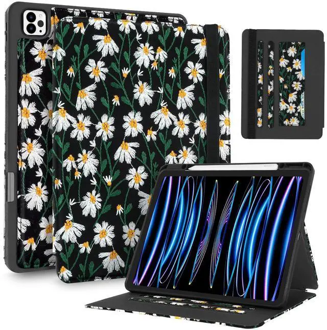 Uppuppy for iPad Air 13 Inch Case M3 2025/M2 2024, for iPad Pro 12.9 Case 6th/5th/4th/3rd Gen - Women Girls Cute Embroidered Folio Stand Cover with Pencil Holder & Card Slot Girly Black Daisy Floral