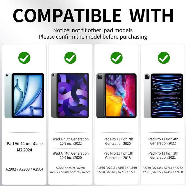 Models: A2902/A2903/A2904)Ipad air 5th generation ( 10.9 -inch, 2022 Released, Models: A2588/A2589/A2591)Ipad air 4th generation ( 10.9 -inch, 2020 Released, Models: A2072/A2316/A2324/A2325)Ipad pro 11 inch 4th/3rd/2nd/1st (Models: A2759 A2435 A2761 A2762 A2377 A2301 A2459 A2460 A2228 A2068 A2230 A2231 A1980 A2013 A1934 A1979)2. Special featuresShockproof, Scratch-proof, Slim, Lightweight, Tri-fold Stand