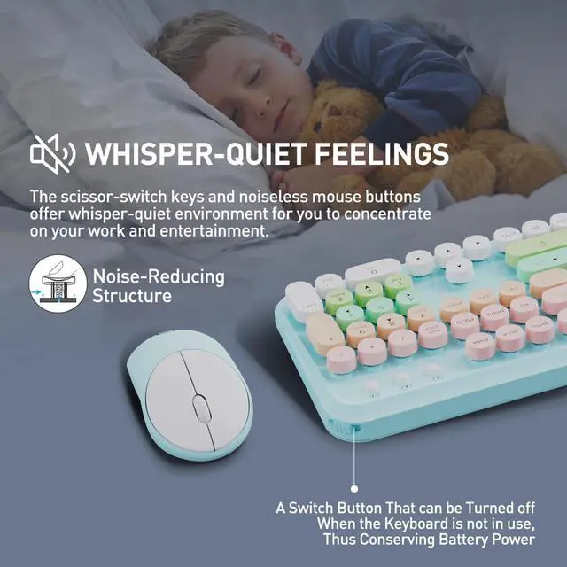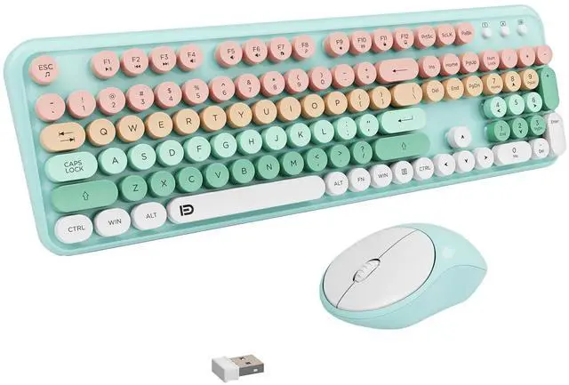 Blue Colorful Wireless Keyboard and Mouse - Warranty We offer a three-year worry-free warranty and a 60-day money-back guarantee or replacement option. If you have any inquiries or concerns regarding our colored wireless keyboard and mouse, please don't hesitate to contact us. Your satisfaction is our top priority. ^^ Fashion & Quiet Mouse Design Desk Accessories Keyboard - Stylish retro keyboard and mouse wireless with colorful round 105keys and glossy smooth edges to brighten your workspace. Featuring low-profile whisper-quet technology, this sleek combo ensures a distraction-free typing experience. Perfect for modern desks seeking cute wireless keyboard and mouse aesthetics.
