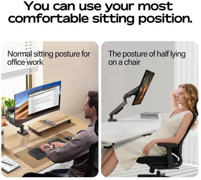 Setup: The monitor desk mount has a quick-install VESA head, so you can mount your 32 ultrawide monitor in seconds. The package includes clear, detailed instructions and labeled components for a smooth assembly. Plus, built-in cable management keeps your wires tidy and organized for a clean, streamlined workspace ^^ Flexible AdjustmentTilt (+90 to -45), swivel (180), and rotate (360) your screen effortlessly. Ultrawide montior arm with 17.3" height adjustment and 20.5" extension range, it adapts to standing desks, gaming setups, or shared workstationsMeets optimal viewing comfort, work smarter and feel better every day ^^
