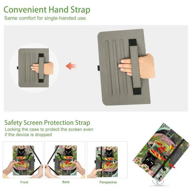 Screen Protection Band: Tie and lock the iPad Case with the Screen Protection Band when not using the iPad. To keep the case closed if the device falls, and gives much better protection to the screen. To protect your privacy more effectively. Add an extra lock to your privacy when you're not using; The Convenient Hand Strap beside the stripes enables you to hold it more stable when stays upright. Same comfort for single-handed use.