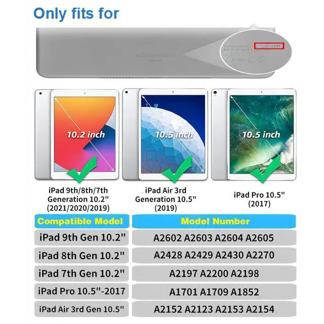 Durable & Environmental Material 10.2 inch kids iPad case is made of durable, heavy duty non-toxic EVA foam material, is shock and water resistant to prevents bumps, dust, scratches and spills from damaging the iPad 10.2 tablet, Corners feature double thick padding for ultra protection ^^ Compatible ModelsYWYNI case compatible with 10.2 inch new ipad 9th generation (2021 Released) /iPad 8th Generation (2020) /iPad 7th generation (2019). Suitable for iPad 9th/8th/7th Generation (A2602 A2603 A2604 A2605/ A2270 A2428 A2429 A2430/ A2197 A2198 A2200),, iPad Air 3rd gen 10.5" 2019 (A2152 A2123 A2153), and iPad Pro 10.5" 2017 (A1701 A1709).
