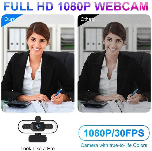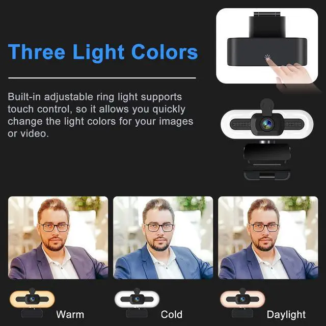 Full HD 1080P Webcamwith 2 million pixels HD glass lens, this web cam delivers smooth & sharp videos at 1080P/30FPS, making you look like a pro at work. The computer camera also supports automatic gain and automatic white balance. Even in places that are too dark or too bright, it could adjust and correct the color and light, and make video conferences or video calls with your colleagues and friends anytime, anywhere. ^^ 3 Level Adjustable Touch Fill Light The built-in fill light can be controlled by the touch switch on the top of the web cam.