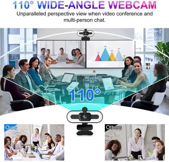 3 light colors at Warm, Cold and Daylight to adjust the fill light and achieve the ideal brightness condition in a dim lighting environment. ^^ 110 Wide Angle viewThe web camera can take a video at a wide-angle of up to 110, which is very suitable for video conferencing, live broadcasts, online learning and teaching, recording, game, or multi-person chat, and more. The 110wide-angle view support to accommodate more participants. In a video call, no need to frequently adjust the orientation of the webcam to show people in different locations anymore.