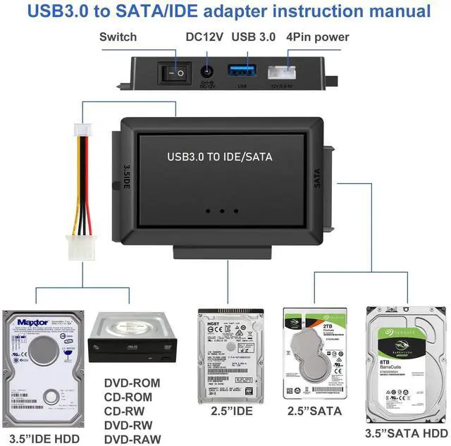 Unlock Your Digital Past with Ease Tired of old hard drives gathering dust in a drawer? Our USB 3.0 to SATA/IDE Adapter is the simple, powerful, and complete solution you need to access decades of stored data. This versatile adapter acts as a universal bridge, connecting almost any legacy 3.5 / 2.5 IDE (PATA) or modern SATA hard drive directly to your computers USB port. Why Choose Our Adapter? Dual