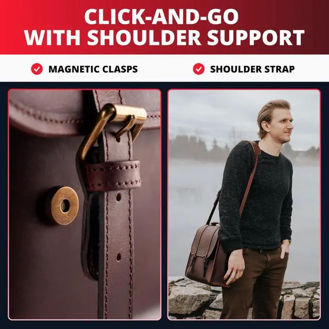 Premium-grade, oil-tanned leather ensures a classic look that only gets better with age. ^^ 16-inch laptop sleeve keeps your computer safe. ^^ Single leather handle provide easy carrying options and minimalistic styling. ^^ External side and back pockets for easy access and extra security. ^^ Magnetic clasps give you modern access while keeping a vintage buckle look. ^^ Removable shoulder strap for convenience and comfort.