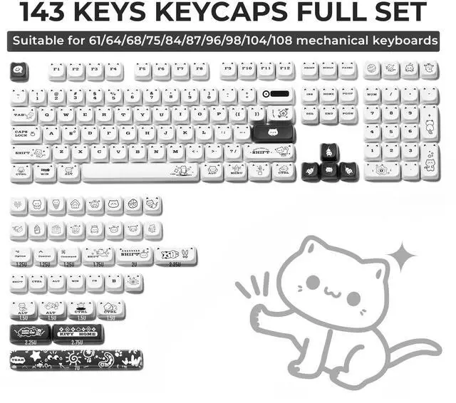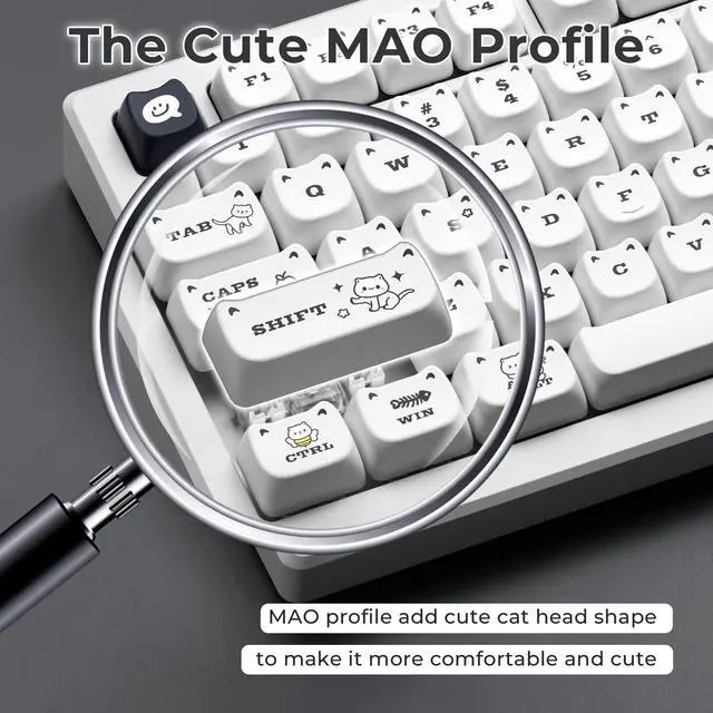 Cute Cat KeycapsStep into a Meow Meow world, unique cat ears keycaps with various cute cats in your keycaps that transforms your keyboard into a delightful menagerie. It's a must-have for enthusiasts who want to infuse their workspace with a dash of whimsy and a whisper of comfort, turning the mundane into the extraordinary. ^^ MAO Profile Keycaps It is optimized according to MAO profile keycaps, the keycap set is same height designed as MAO and the surface area combine with cat ear-shape. It is both ergonomic and pleasant to your mood when you are using the keyboard.