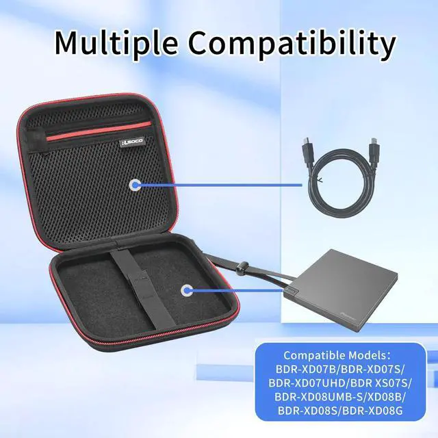 Perfect Matching -- It's particularly designed for Pioneer BDR-XD08B/BDR-XD08UMB-S/BDR-XD08S/BDR-XS07S/BDR-XD08G/BDR-XD07B External Blu-ray Drive. It's a customized made carrying Case to fit them. ^^ Excellent Material -- Using the superior EVA material on the shell, which keeps your Pioneer Slim Portable BD/DVD/CD more safe and scratchable. The high-quality YKK zipper we use if of precise Japanese technology, which ensure the quality. ^^ Compact Compartment -- Compare to other cases in the market, this case is compact but holds almost your Pioneer BDR and accessories. There's a whole mesh pocket at the upper with zipper to hold your accessories totally and keep them sturdy.