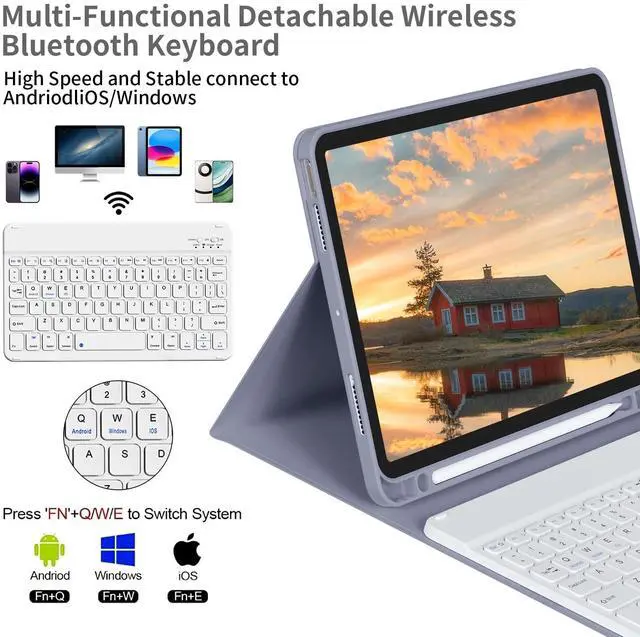 KVTVOU iPad keyboard case contains componentsTPU case and wireless bluetooth keyboard. TPU case1. The material is TPU case and leather cover. 2. Built-in pencil holder. 3. Auto sleep/wake. 4. Multiple Viewing Angles. 5. Precise cutouts. Wireless Bluetooth keyboard1. Wireless bluetooth. 2. Long battery life. 3. Auto Sleep. 4. Slim, lightweight, portable. 5. magnetic suction. Bluetooth keyboard connection instructions1. Turn on the keyboard. 2. Press the "Connect"button to 3 seconds. 3. Open the Bluetooth from settings in your IPAD and find the Bluetooth keyboard, then click and connect (Password free connection).