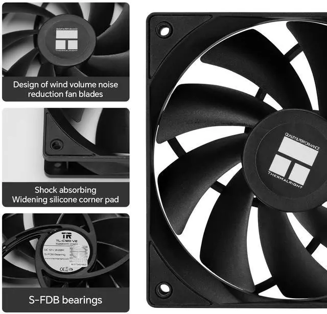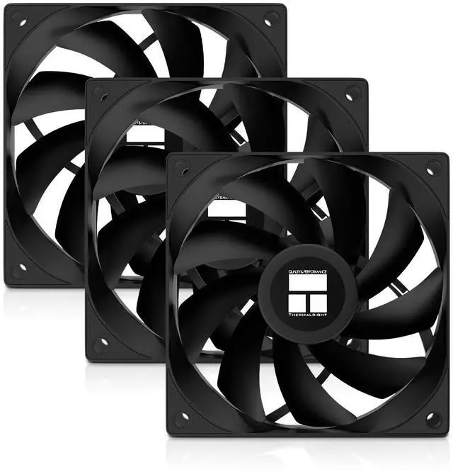120mm Case Fans 3-Pack for PC TL-C12B V2 X3 includes three 120mm case fans in one kit, ideal for upgrading intake and exhaust airflow in gaming PCs, workstations and desktop builds ^^ 4-Pin PWM PC Fans, 1500 RPM Max Standard 4-pin PWM connector lets your motherboard control fan speed up to 1500 RPM for the right balance between cooling performance and noise ^^ High Airflow & Static Pressure Each 120mm PC fan delivers up to 66.17 CFM of airflow and 1.53 mm H2O air pressure, suitable for computer case ventilation, CPU coolers and radiator cooling ^^ Quiet S-FDB Bearing Design S-FDB bearing and a rigid frame help reduce vibration and keep noise levels up to 25.6 dBA, making these computer case fans suitable for quiet office or gaming environments ^^ PC-Friendly Size & Compatibility 12012025 mm 12 V, 0.20 A fans with a 4-pin PWM connector fit standard PC case fan mounts; package includes three TL-C12B V2 X3 120mm case fans for easy installation.