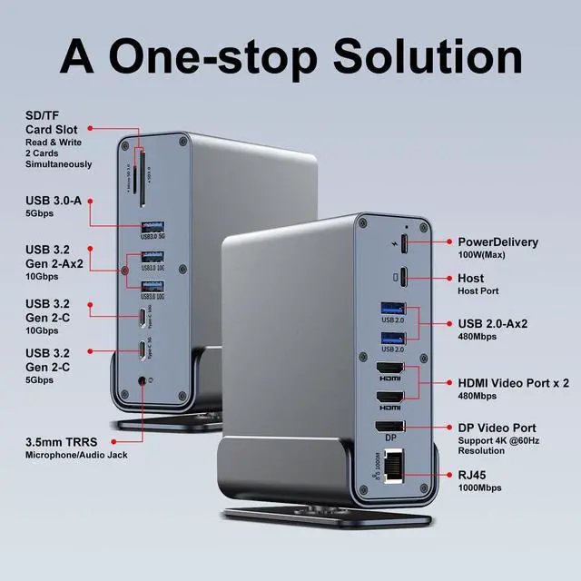 2. 15-in-1 Comprehensive Hub with 100W Charging This all-in-one dock eliminates dongle clutter! It features Gigabit Ethernet, a 100W PD charging port (keeps your laptop powered), 10Gbps USB-C and USB-A data ports, USB 3.0/2.0, 3.5mm audio, and SD/TF card readers. Connect all your accessories and peripherals through a single USB-C cable.