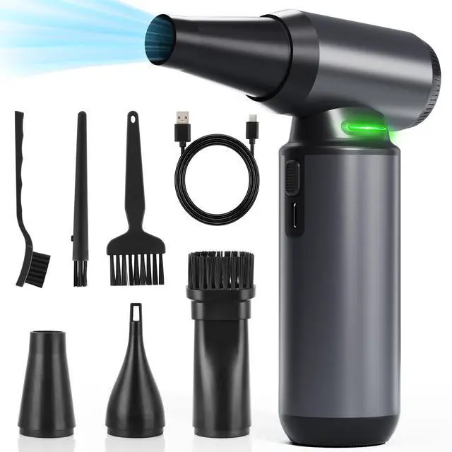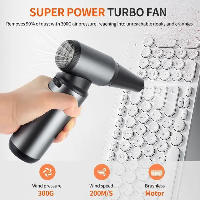 BRUSHLESS MOTOR FOR ULTRA-STRONG AIRFLOW: This electric air duster is powered by a next-gen 300, 000RPM brushless motor that generates up to 300g wind pressure and 200m/s wind speed. The powerful airflow easily blasts away dust, pet hair, and debris from hard-to-reach areas like keyboards, PC fans, laptops, vents, and car interiorsmaking deep cleaning faster and more efficient than traditional canned air. ^^ MASSIVE 8000mAh