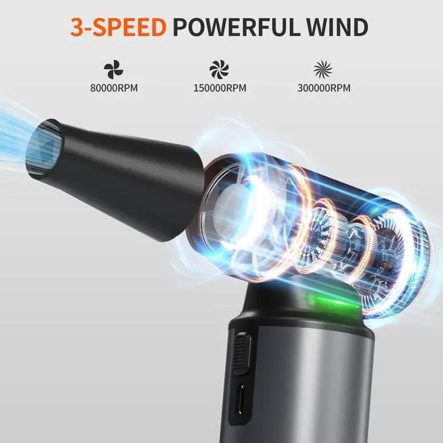 RECHARGEABLE BATTERY WITH USB-C CHARGING: Equipped with an upgraded 8000mAh lithium battery, this cordless air blower offers over 150 minutes of runtime on a full charge. The USB-C interface supports fast recharging in just 34 hours, ensuring consistent high-performance cleaning. It's the perfect portable solution for home, office, or outdoor use without the need for disposable air cans. ^^ 3-SPEED