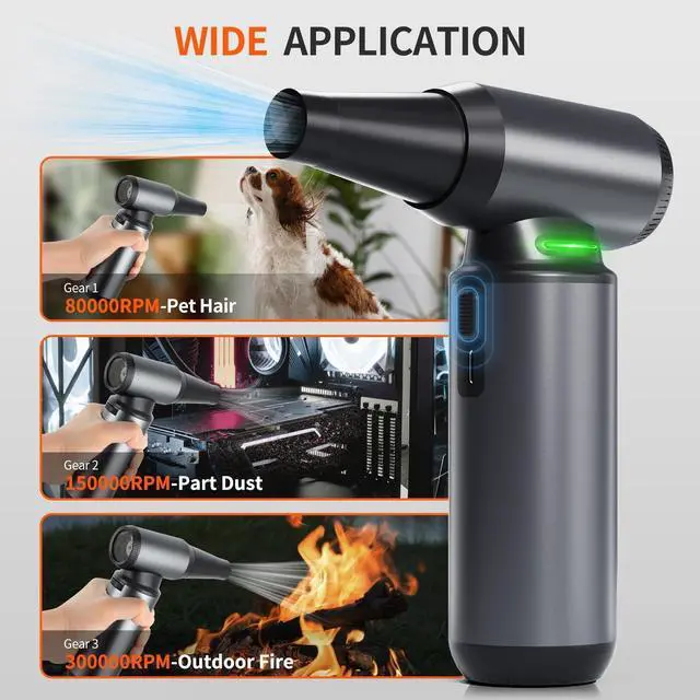 ADJUSTABLE MODES FOR VERSATILE CLEANING: Customize airflow to match different cleaning tasks using three speed settings80, 000RPM for gentle dusting, 150, 000RPM for electronics, and 300, 000RPM for stubborn dirt or even fire ignition. Whether blowing out pet hair, dust particles, or igniting a campfire, this powerful duster meets all your indoor and outdoor needs with adjustable precision. ^^ LIGHTWEIGHT, dURABLE