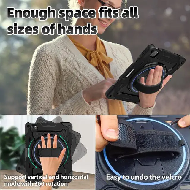 Generation (Model: A1980 A2013 A1934 A1979) ^^ [ Built in HD Screen Protector] Case for iPad pro 11 inch and iPad air 4th/5th generation 10.9 inch made of silicone and rubber are very flexible and offer great grip, shock resistance. Built in screen protector and keep screen of your iPad from cracking and scratching, eco-friendly durable case for kids ^^ [3-layer Full Body Protection] 1.2 inch soft airbag rubber part + front screen of the case + hard PC back cover = ensuring your iPad safe even if dropping it from 5ft place, kiddo drop protection. Easy to turn on/off volume and power buttons ^^ [Two Horizontal and Vertical Viewing Angles ] 360 rotating stand on the back can be used in either horizontal or vertical direction, one low angle one high angle to meet your needs, easy to snap in place and back automatically ^^ [Rotating Hand Strap & Shoulder Strap & Pencil Holder] Adjust rotating hand strap for horizontal or vertical direction fits all size of hands (Small, Medium, Large, Extra-Large) & 59 inches length of shoulder strap & there is a Stylus Pen Holder on the back to store your pen (Pencil is NOT included)