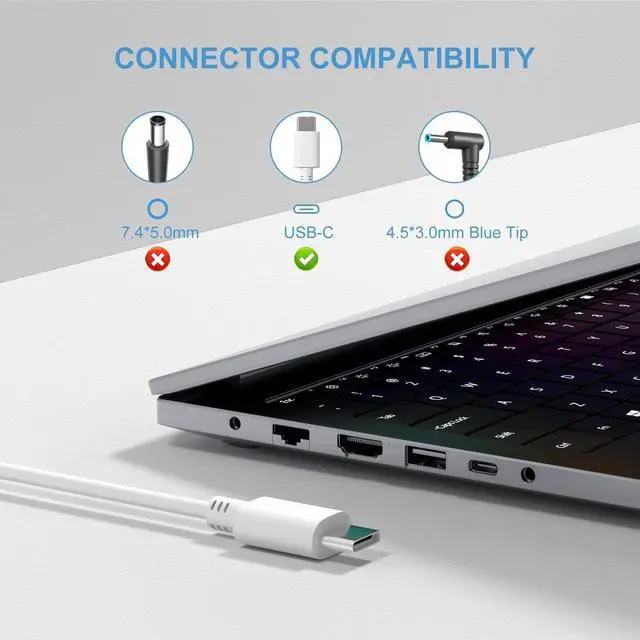 Connector Size: Type C ^^ The laptop charger port output up to 65W power delivery enables fast and efficient charging of compatible devices; ^^