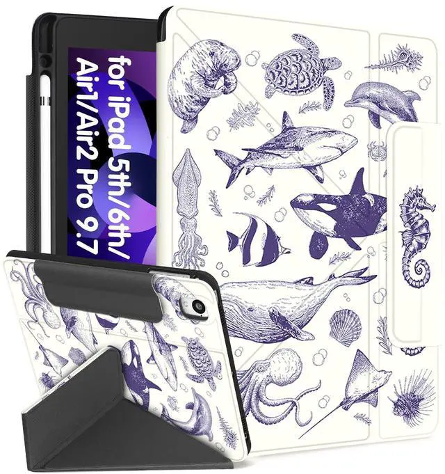 Miss Adola for iPad 6th/5th Generation 2018/2017 Case for iPad Air 2nd/1st Pro 9.7 Inch with Pencil Holder Cute Cool Cartoon Anime Kawaii Design Tablet Cover for Boys Girls Women, Sea Fish