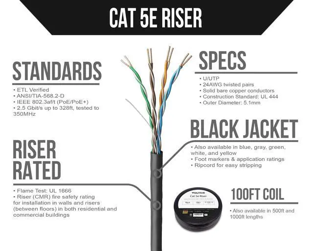 CAT 5E NETWORK CABLE. 24 gauge, 4 pair, solid copper conductors, unshielded (UTP). 1 Gigabit and 2.5 Gigabit speeds up to 328ft. ETL Verified. Tested to 350MHz. PoE, PoE+, & 4PPoE/PoE++. ^^ OXYGEN-FREE COPPER. Oxygen-free copper (OFC) conductors result in less signal loss and are more durable than conductors made of copper-clad aluminum (CCA). ^^ RISER RATED. Riser (CMR) fire safety rating for installation in walls and risers (between floors) in both residential and commercial buildings. UL Certified/Listed. ^^ STANDARDS.