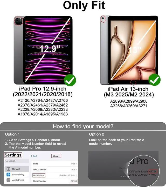 • Compatibility ModelZktuyu Case specially for iPad Air 13-inch M3 2025 (A3268/A3269/A3271), for iPad Air 13-inch M2 2024 (A2898/A2899/A2900), for iPad Pro 12.9 inch 6th Gen 2022 (A2436/A2437/A2764/A2766), for Pro 12.9 5th Generation 2021 (A2378/A2379/A2461/A2462), for Pro 12.9 4th Gen 2020 (A2229/A2069/A2232/A2233), for Pro 12.9 inch 3rd Gen 2018 (A1876/A1895/A1983/A2014). please find the No. "AXXXX" before order (Open settings > General > About, Tap the M part reveal the A model number)