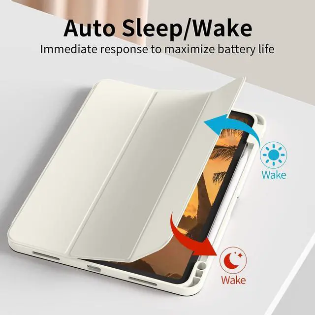 (Note: Apple Pencil not included) ^^ Viewing & Typing ModeTrifold stand design with dual standing provide two positions for comfortable viewing or typing, you can have an excellent experience when you are relaxing or working ^^ Auto Sleep/Wake FeatureBuilt-in magnetic strip provides auto sleep/wake features, save the energy when the cover closed, protects and extends battery life. Full access to all controls and features(Cameras, Speaker, Ports and Buttons) without remove the case