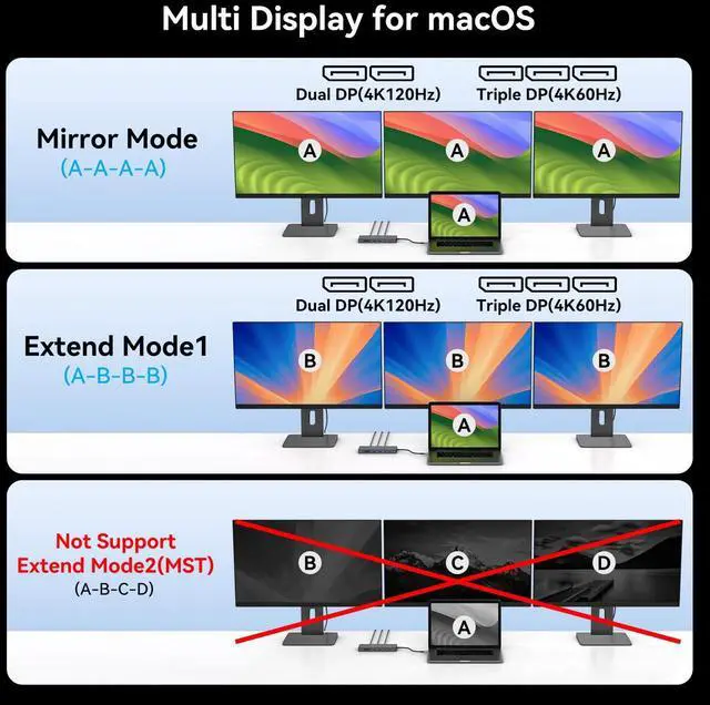 Monitor Docking Station: This triple display USB-C hub supports dual 4K120Hz or triple 4K60Hz high-resolution displays, while also being compatible with both Mirrored Display Mode (SST) and Extended Display Mode (MST), enabling efficient multi-screen task management. To achieve maximum resolution, ensure both your computer and monitors support DisplayPort 1.4 and use a high-quality DP 1.4 cable.