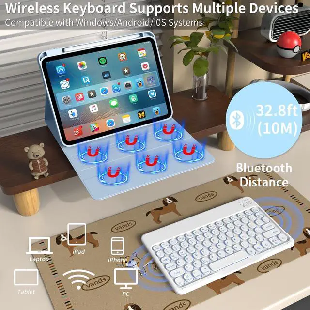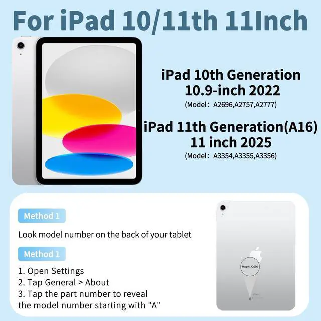 Number: A2696/A2757/A2777). Not for any other models. Please check the model number No. "AXXXX" on the back of your iPad to confirm correct size before purchasing iPad keyboard case. ^^ Magic Detachable KeyboardFor ipad (A16) 11th/ 10th generation. 11/ 10.9 inch Keyboard case is magnetic and keyboard can be strongly attached to the case or detach completely. When you do not need the keyboard can be stored away, easy to carry it on the go. Equipped with useful shortcut keys keyboard is easy, fast and stable to connect via BT, reconnect immediately turning it on. ^^ Multiple Viewing AngleThere are designs inisde of the case provides the you would stand angle, so you can change where the tablet is on the case and adjust the screen angle this way for drawing or writing on, do more computerig, suitable for home, office or school use. ^^ Long Life Battery Rechargeable KeyboardiPad keyboard Built-in powerful 420mAh battery and enters energy-saving mode automatically if not in use for 15 minutes, which worry-free use and long standby time. Using a Type-C charging port of keyboard charges faster, only 2-3 hours full charge.