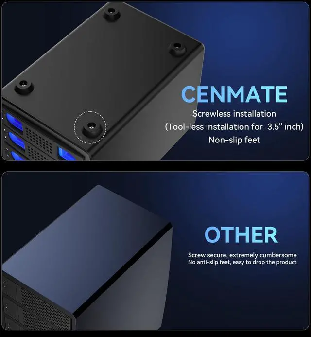 Reliable External Storage System for Individuals and BusinessThe 4 Bay Hard Drive Enclosure supports 2.5 / 3.5 inches HDD and SSD, max capacity up to 80TB ( 20TB for each hard drive), it's a ideal external hard drive enclosure for personal or enterprise using. Save space on your desktop or laptop. ^^ No heatThe 4 bay hard drive reader built in Aluminum-Alloy materials and 2 inch Fan. Maximize the security of your data. NOTEFan noise is around 40-50 decibels, not recommended if you are very sensitive to noise. ^^ Up to 5GbpsThis 4 bay enclosure equips with advanced chip and USB 3.0 output interface, Max 5Gbps under UASP control.