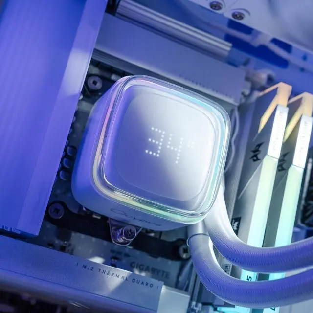 FLOATING VISUAL DESIGNOcypus Iota aio 360mm flat digital display is elevated through the high-transparency cover, creating an enhanced sense of space, as if suspended within, presenting rich spatial layers ^^ REAL-TIME DIGITAL DISPLAYReal-time display of CPU or GPU temperature, with the option to switch between Celsius and Fahrenheit using Ocypus Digital software. (Max display temperature 199F) ^^ SUPERCHARGED ENGINE PUMP70*70*65mm 360 aio pump will Efficiently manages liquid cooling circulation, ensuring sustained high-performance output, significantly lowering core temperatures ^^ 360MM ALUMINIUM RADIATORAluminum radiator provide more efficient cooling solution for Ocypus aio cpu cooler, the efficient and lightweight design reduces stress on your case ^^ ARGB LIGHTING CONTROLIota aio cooler 360mm supporting ARGB independent control, compatible with various motherboard lighting control softwares, easily managing pump lighting effect ^^ LOW-NOISE FANS3120mm silent fans(29dB (A) )