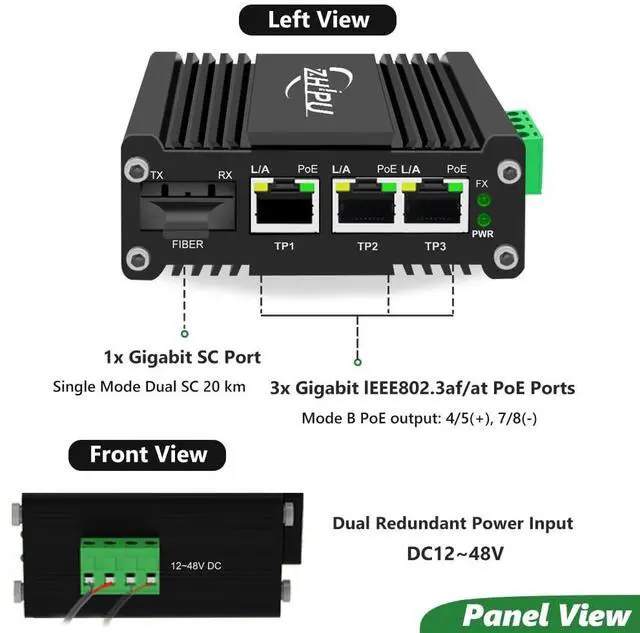 Overview: The Industrial Gigabit 3-Port PoE Switch is a Mini Industrial 3-Port 10/100/1000T 802.3 at PoE + 1-Port 1000X SC Gigabit Ethernet Switch with 12~48VDC Input and Voltage Booster. This unmanaged industrial solar power PoE switch is designed to match the critical industrial standards. With reliable and simple operation against vibration and shock, and wide operation temperature range(-40F to 176F), it could match a variety of harsh environment.