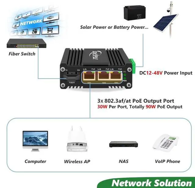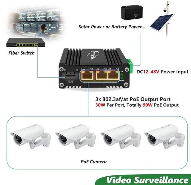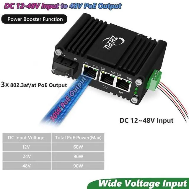 Features: 1. 3 10/100/1000BASET RJ45 auto-MDI/MDI-X ports with IEEE 802.3 at PoE+ Injector (Port-1 to Port-3)2. 1 1000Base-X SC Port3. 12~48VDC wide range power input with power booster function4. Up to 90W PoE budget (48VDC), 90W PoE budget (24VDC), 60W PoE budget (12VDC) 5. Supports Full/Half-duplex, Auto-negotiation6. IEEE 802.3 az Energy Efficient Ethernet (EEE) 7. Industry standard design, dust-proof and close design IP40 Aluminum Case8. Supports DIN-Rail installation9. Environmentally hardened -40C to 75C (-40F to 167F) operating temperatureSpecification: 1)