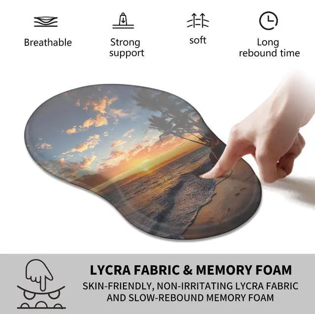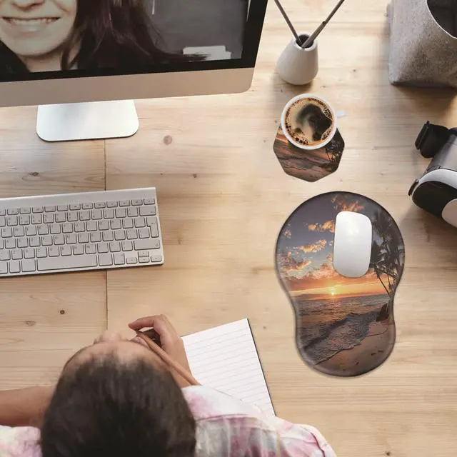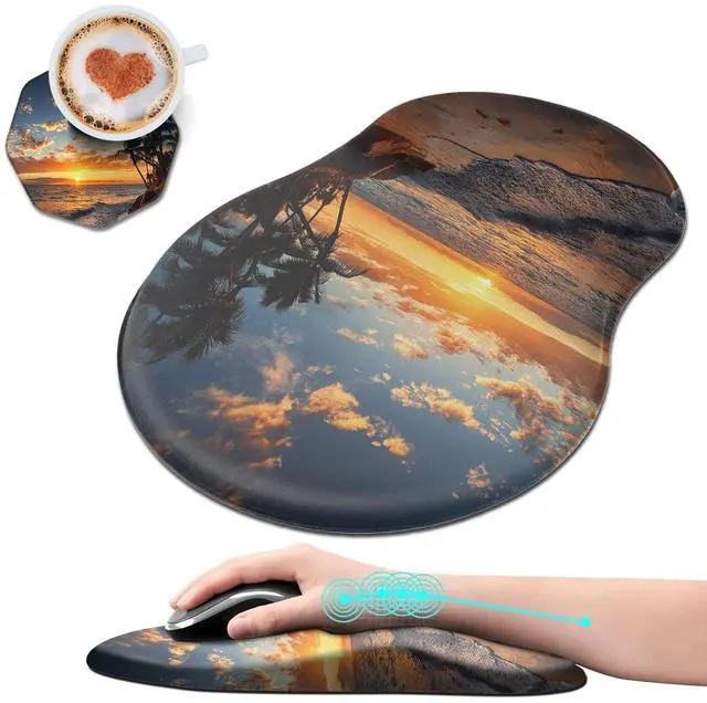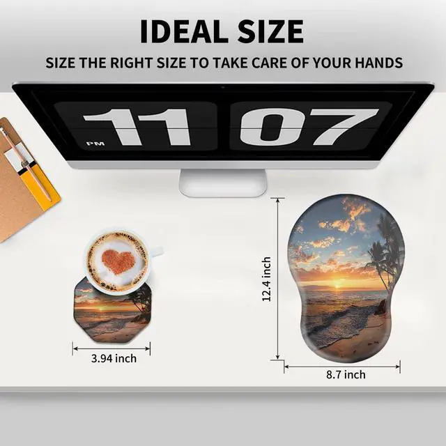 Unique Shape and Size-- 13x 8.66 x 0.86 inches; Coffee Coaster 4" x 4" x 0.08" mouse wrist rest pad fits all types of mouse, wired, wireless, mechanical, laser & optical. The reinforced edges of mousepad prevent deformation and damage to guarantee long term use. High quality materials-- This mouse pad is made of memory foam with no additives or fillers. And the cover is made of soft and smooth fabric, no irritation to skin, is able to track the mouse movements fast and accurate. Not easy to curl up on the edges even after long time usage.