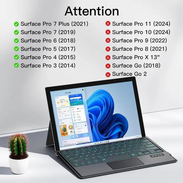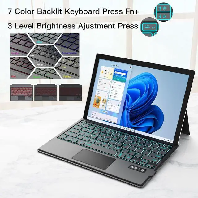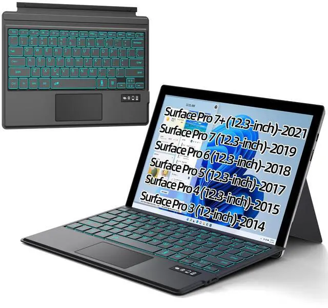 Wide Compatibility: Compatible with Microsoft Surface Pro 7 (2019) / Surface Pro 7 Plus (2021) / Surface Pro 6 (2018) / Surface Pro 5 (2017) / Surface Pro 4 (2015) 12.3 inch / Surface Pro 3 (2014) 12 inch, please check your tablet model carefully beofore you purchase ^^ 7 Colors LED Backlit & Three-level Brightness & Long Time Operation: This bluetooth surface pro keyboard with 7-Color elegant LED backlight and 3 brightness level, providing you with a different visual typing atmosphere. Press "Fn+ " or "Fn+" key to change the brightness, press F7 to change backlit color. Built-in rechargeable battery for long keyboard life and continuous use, extra long standby time up to 100 days and continuous usage time up to 35 hours per full charge (2-3 hours) ^^ Steady Bluetooth 5.0 Technology &