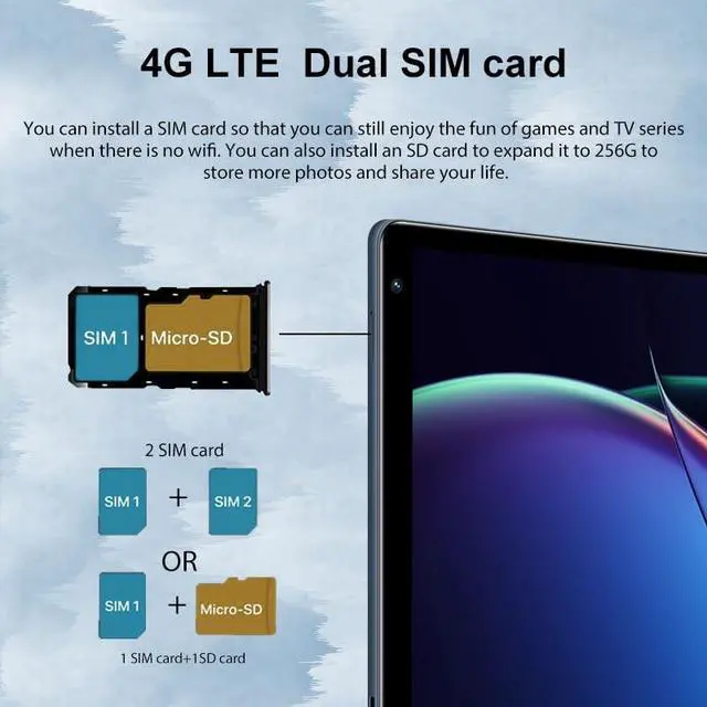 SIM: This tablet can be equipped with 2 SIM cards and supports the following network frequency bands (4G: B1-B2-B3-B4-B5-B7-B8-B12-B17-B20-B28-B38-B39-B40-B41), allowing you to use it even without wifi. It is equivalent to a mobile phone with a very large screen. However, before purchasing, it is necessary to confirm with the local network provider whether the network frequency band is available. (The SIM card is not included) ^^ 3GB
