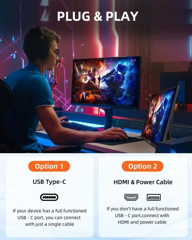 ^^ Plug and Play with Multiple DevicesDual ports (USB-C and HDMI) ensure quick setup without drivers. Compatible with Windows, macOS, Linux, Nintendo Switch, PS5, and other gaming consoles, this portable monitor seamlessly extends your device's display.