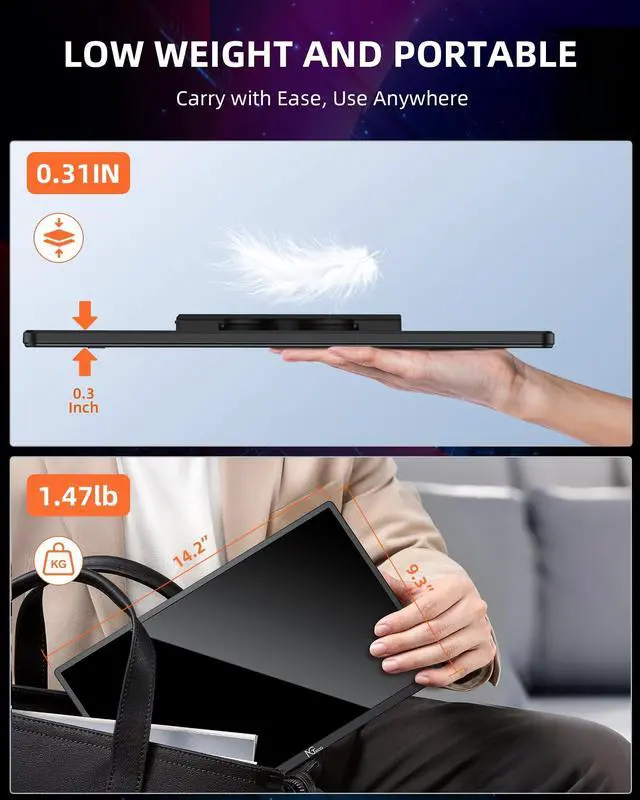Ultra-Clear 1200P Display with Vivid ColorsEquipped with a 16" Full HD 19201200 IPS screen, this monitor offers sharp visuals, 100% sRGB color gamut, and 300 nits brightness for true-to-life colors and enhanced visual clarity in any lighting. ^^ Ultra-Slim & Lightweight for On-the-Go ProductivityDesigned for portability, the N3 weighs only 1.46 lbs and is less than 0.3 inches thick. It easily fits into backpacks and briefcasesperfect for remote work, travel, or mobile presentations. ^^ 360 Foldable Stand & Multi-Angle ViewingThe built-in stand supports a full 360 rotation and 90 tilt, allowing you to customize the viewing angle for presentations, dual-screen setups, or vertical document viewing.