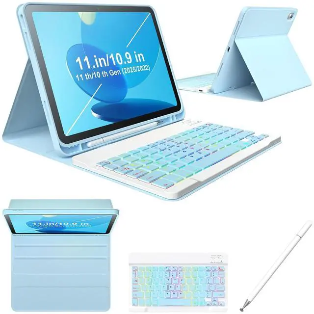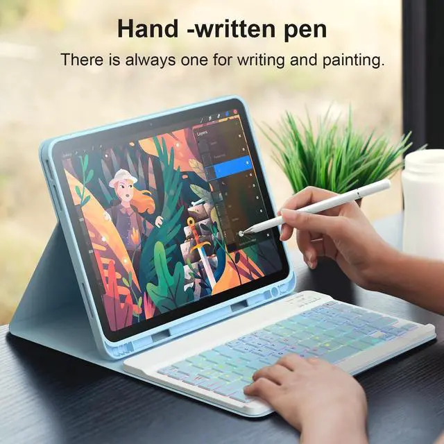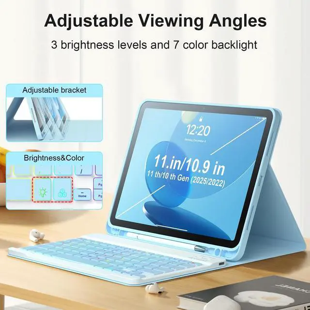 Adjustable Backlight Bluetooth Keyboard: Our iPad 10th generation bluetooth keyboard features a backlight key design, with levels of brightness bright colors that can shine in the dark, providing you with a comfortable typing experience in both dark and bright environments, giving your eyes a refreshing feeling. Bluetooth connection is very simple ^^