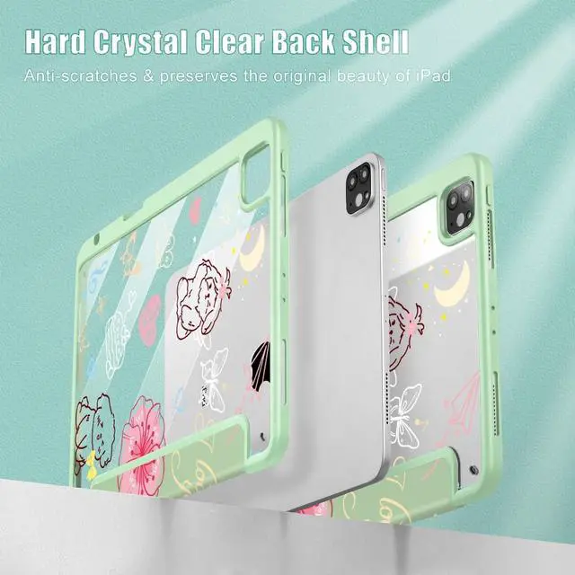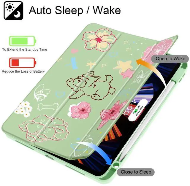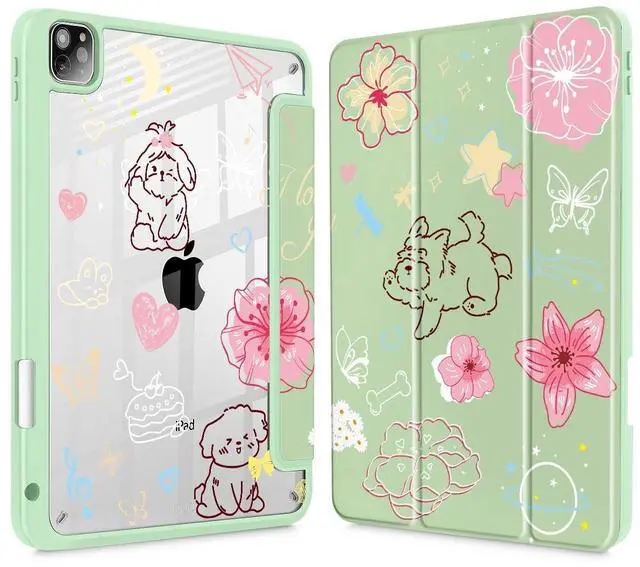 May Chen for iPad Pro 11 inch M2 4th Generation 2022, iPad Pro 11 3rd/2nd/1st Gen, Case with Transparent Shockproof Back Cover [Built-in Pencil Holder, Auto Sleep/Wake, Green Flower Dog