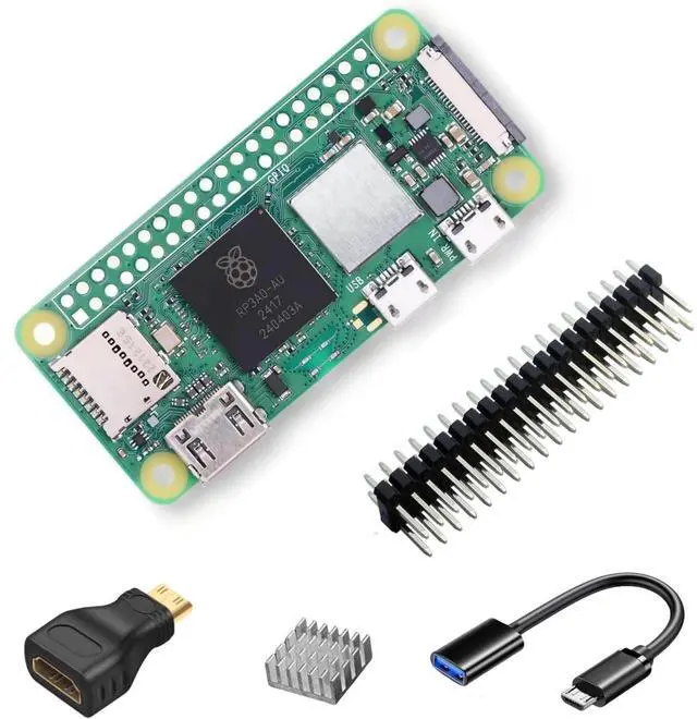 Kit: The Pi 2W pack includes Raspberry Pi Zero 2 W Board x1, Mini HDMI to Standard HDMI Adapter x1, Micro USB OTG Cable x1, Aluminum Heatsink x1, 40-Pin Header x1.