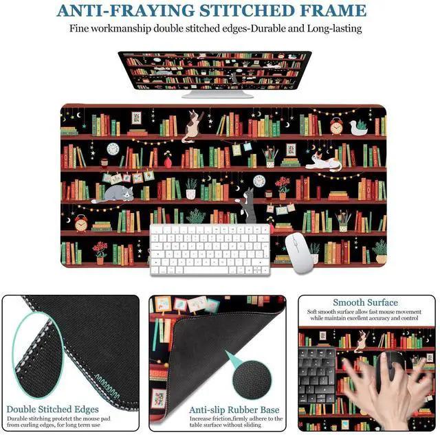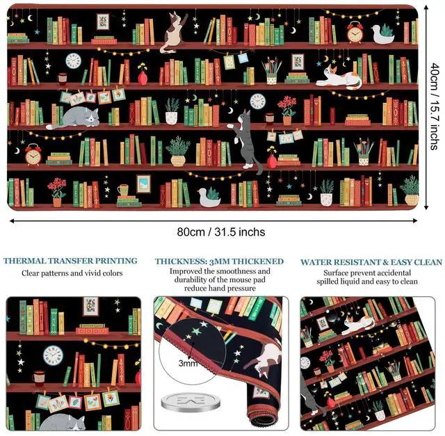 Cutebricase Desk Pad with Bookshelf Cat PatternAbout Cutebricase BrandOwn professional pattern design department. Committed to manufacturing high quality, stylish and attractive unique design. Focus to product comfortable and premium decoration, let you feel the nature and enjoy colorful lifeExtended XXL Large Mouse Pad SizeFunny Cat desk mat measures 31.5" 15.7", provides ample room to fit your gaming mouse, full-size mechanical keyboard, and other desk items. Keep your desk clean and uncluttered with the freedom to configure your setup as desired. Perfect for gamers who use a lower DPI or need more room to maneuver.