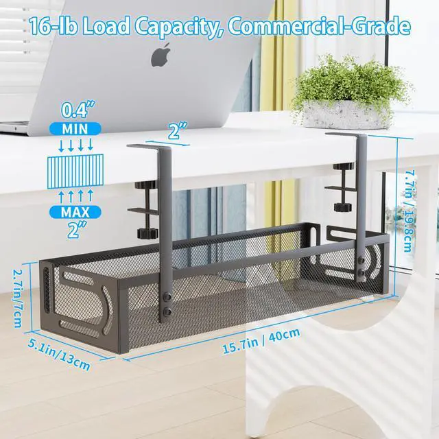 It can be flexibly mounted either inward or outward on your desk as needed. Measuring 15.7" L x 5.1" W x 2.7" H, its roomy enough for power strips and bulky adapters. Most importantly, it keeps cables and sockets out of childrens reach, eliminating concerns about tripping hazards and electric shock. ^^ One-Stop Solution for Cable ManagementElevate your cord organization with 4 essential accessories: 6-hole cable holder (x1), cable clips (x6), Multi-Color cable labels (x8), and reusable cable ties (x10). This set saves you 30% compared to buying each item separatelyno extra purchases needed to solve your cable clutter. ^^ Premium QualityCrafted from carbon steel, this tray holds up to 16 lbs for long-lasting daily use. This fully welded and powder-coated cable tray is not easy to rust or accumulate dust, making it perfect for home offices, workspaces, and commercial setups alike. ^^ Fit & After-Sales NoteOur cable tray fits flat-edged desks 0.42 inches thick. If the table has built-in drawers or back-rod, make sure there is at least 2 inches of space along the edges. If you have any questions during use, feel free to reach outyour satisfaction is our top priority.