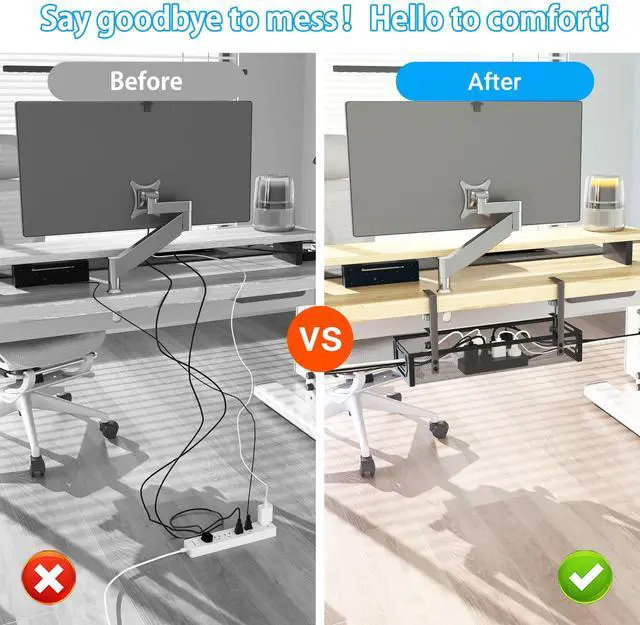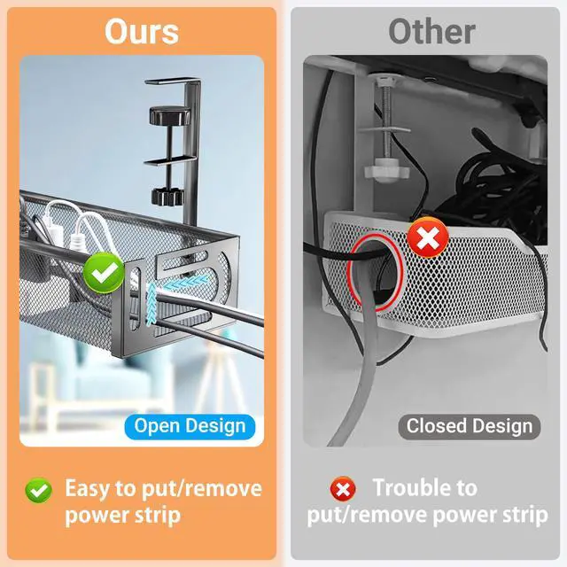 No Need for Drilling HolesDue to its Clamp-Style Design, our cable management tray can be mounted directly onto desk frames and easily repositioned as neededno screws, no desk damage. It can be conveniently clamped to desks made of wood, glass, or any other common materials. It also comes with non-slip soft silicone pads on the clamp to protect your desk from scratches. ^^ Unique Design & Larger SpaceThe side of our cable organizer adopts an open design, making it easier to put in and take out cables, while the mesh design maximizes airflowpreventing power supplies from overheating and reducing dust accumulation.