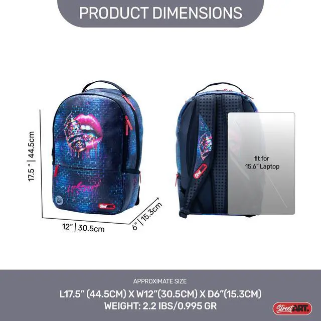 DescriptionPerfect for college, this backpack features a discreet hidden pocket on the lower right backideal for keeping your wallet, phone, and other valuables secure and out of sight. Sleek computer backpack featuring three spacious zippered compartments and a dedicated laptop sleeve. Designed to fit laptops up to 15.6 inches, within a 17.5 -inch frame backpack for Men and Women in Designer theme. Measuring 17.5 *12*6 inches, weight 0.9 kg. Versatile and multifunctional enough for Collage or the workplace, this designer backpack features bold, artistic graphicsmaking it a perfect gift for Christmas, birthdays, or Collage season.