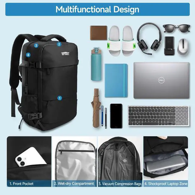 Cabin Size: The Smarter Suitcase A 55L backpack cant be a carry-on? No. This travel backpack with vacuum system lets you pack like a suitcase (about 6-8 days clothing) yet compresses slimmer than a 20-inch roller. Our system removes air and bulk, not space. The result is a compact pack with an airline-compliant size that fits as a personal item under the seat on most flights (always check your airlines specific rules). Clamshell opening keeps all organized ^^ Professional Organization & Built to Last- Your All-Weather Travel Hub. Engineered for order and durability. The vacuum seal bags for clothing features a padded 17-inch laptop compartment, separate wet/dry pocket, and quick-access organizers. Built from water-resistant, scratch-proof materials with a 3-year manufacturers warranty. The 180 clamshell opening speeds up packing and security checks, while reinforced zippers ensure a secure compression seal ^^ Engineered for Comfort, Tested by Distance- Carry More, Feel Less. This backpack vacuum travel with pump designed for your body. The breathable honeycomb back panel and S-curve shoulder straps evenly distribute weight, turning heavy loads into comfortable carries. Its lightweight yet durable build minimizes fatigue from airports to city streetskeeping you supported all day ^^ The Ultimate Holiday Gifts- Solves Real Packing Problems.