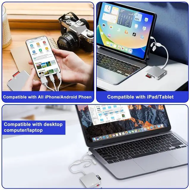 3-in-1 Interfaces for iPhone/Android/PC This memory stick pro duo adapter features Lightning, USB C & USB 3.0 ports, working seamlessly with iPhone 16/15/14/13, Samsung Galaxy S23, MacBook, and Windows PC. 3-in-1 connector eliminates the need for multiple readers - perfect for photographers using SD cards on iPhones or designers moving RAW files to laptops. ^^ Professional 5-Slot Card Support Read & write SD/SDHC/SDXC, TF/Micro SD/Micro SDHC/Micro SDXC, CompactFlash (CF I/II), Memory Stick Pro Duo & Pro-HG Duo, and Fujifilm xD-Picture Cards simultaneously. This sony memory stick pro duo adapter slots handle high-capacity media (up to 2TB SDXC) - ideal for 4K drone footage or legacy camera card backups.
