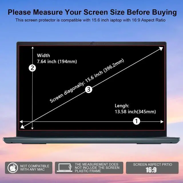 Product Size: DIAGONAL 15.6", WIDTH 13.58 inches (345mm), HEIGHT 7.64 inches (194mm), Please refer to Figure 2 before purchasing(Please carefully check the Height& Width & Screen Display Size before purchasing) ^^ Ultra-Thin Laptop Screen Protector 15.6 inch tempered glass laptop screen protector is only 0.25 mm thick, which restores the original touch to the greatest extent, Compatible with touch screen ^^ Ultra-HD Screen ProtectorThe light transmittance is as high as 99.99 %, without affecting the original picture effect ^^ Anti-Fingerprint and Scratch ResistanceThe hardness of the screen protection film is 9H, which has a strong anti-scratch protection ability. The hydrophobic and oleophobic coating material can prevent fingerprints from being left due to sweat and oily residues ^^ Worry-Free Guaranteeeasy installation, no bubbles, no residue, please