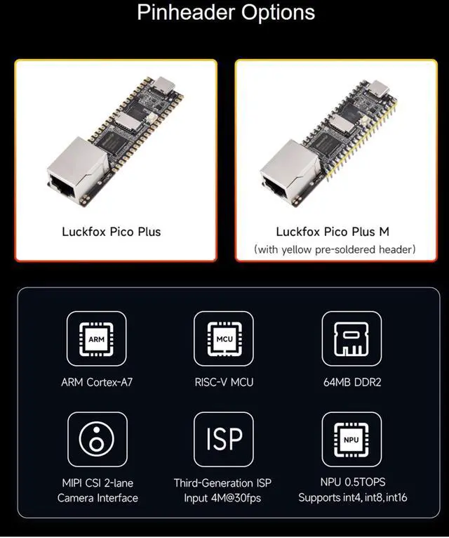 Pico Plus with Pre-Soldered Header is a cost-effective Linux micro development board, based on the Rockchip RV1103 chip to provide a simple and efficient development platform for the developers. Supports a variety of interfaces including MIPI CSl, RGB LCD, GPIO, UART, SPI, 12C, USB, etc, which is convenient for developing and debugging quickly.