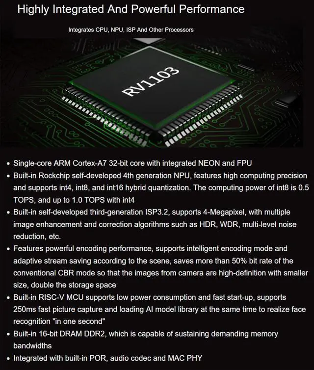 Built-in Rockchip self-developed 4th generation NPU, features high computing precision and supports int4, int8, and int16 hybrid quantization. The computing power of int8 is 0.5 TOPS, and up to 1.0 TOPS with int4Built-in self-developed third-generation ISP 3.2, supports 4-Megapixel, with multiple image enhancement and correction algorithms such as HDR, WDR, multi-level noise reduction, etc. Features powerful encoding performance, supports intelligent encoding mode and adaptive stream saving according to the scene, saves more than 50% bit rate of the conventional CBR mode so that the images from camera are high-definition with smaller size, double the storage spaceBuilt-in RISC-V MCU supports low power consumption and fast start-up, supports 250ms fast picture capture and loading AI model library at the same time to realize face recognition "in one second"Built-in 16-bit DRAM DDR2, which is capable of sustaining demanding memory bandwidthsIntegrated with built-in POR, audio codec and MAC PHY